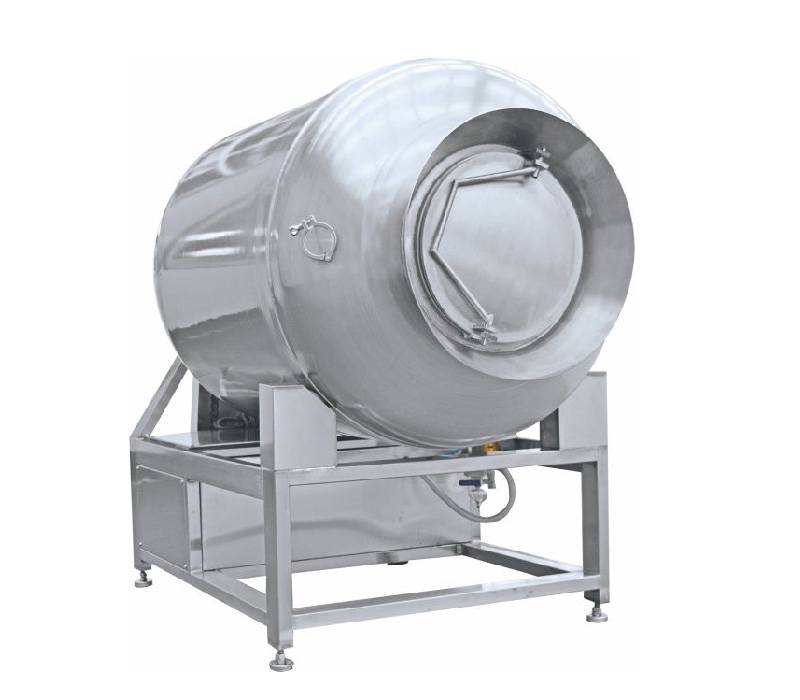 真空滚揉机适用于,肉制品加工,牛羊肉块,酸菜,泡菜腌制均匀拌料的优良搅拌机。真空滚揉机是在真空状态下,利用物理冲击原理,让物料在滚筒内上下翻动,相互撞击、摔打,从而达到按摩、腌渍作用。腌渍液被物料充分地吸收,增强物料的结合力及弹性,提高产品的口感及断面效果;可以增强保水性,增加出品率;可以改善产品的内部结构。整机采用不锈钢304制造,结构紧凑,滚筒两端均采用旋压式封帽结构,更大的增加滚筒内的摔打空间,使滚揉产品的效果均匀,噪音小,性能可靠,操作简便,使用效率更高。